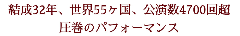 1993年夏、奈良県橿原市にある神社で初めて演奏をして以来、これまでに世界55ヵ国、4700回を超える公演を行い1000万人の観客を動員してきた倭。現在も「世界を旅する和太鼓集団」と称して「呼ばれれば何処へでも行こう!世界中を元気にしよう!」を合言葉に、毎年毎年世界中で公演ツアーを続けています。